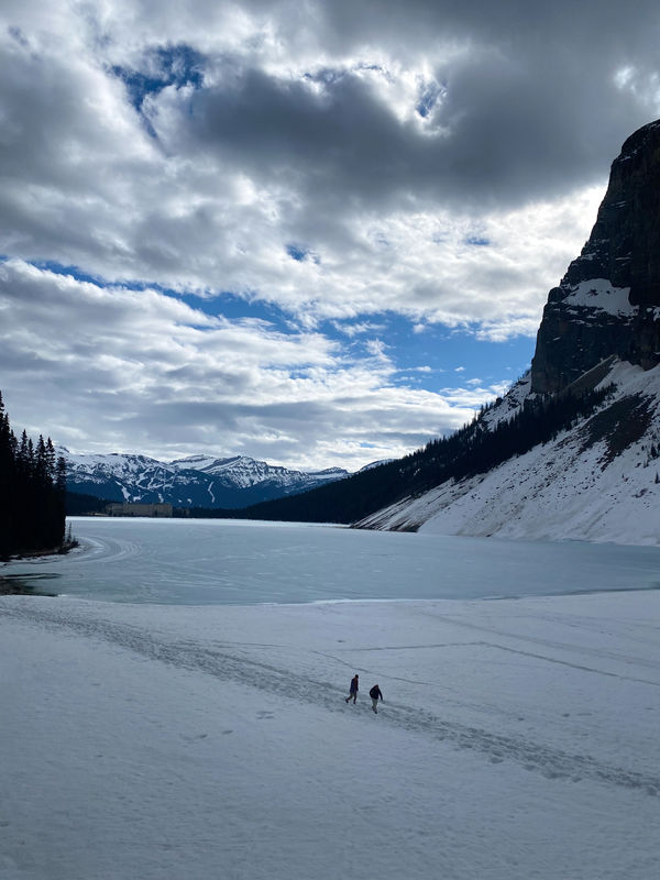 SURPRISE! Lake Louise is still frozen in late May. I should’ve anticipated this, but when I planned the trip in February, the dead of winter and dreaming of warm, sunny days, I latched onto “weather can be hit or miss” and figured of course it’d cooperate for us and the lake would be its usual beautiful turquoise under blue, cloudless skies. Nope. Absolutely not.